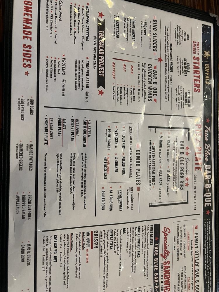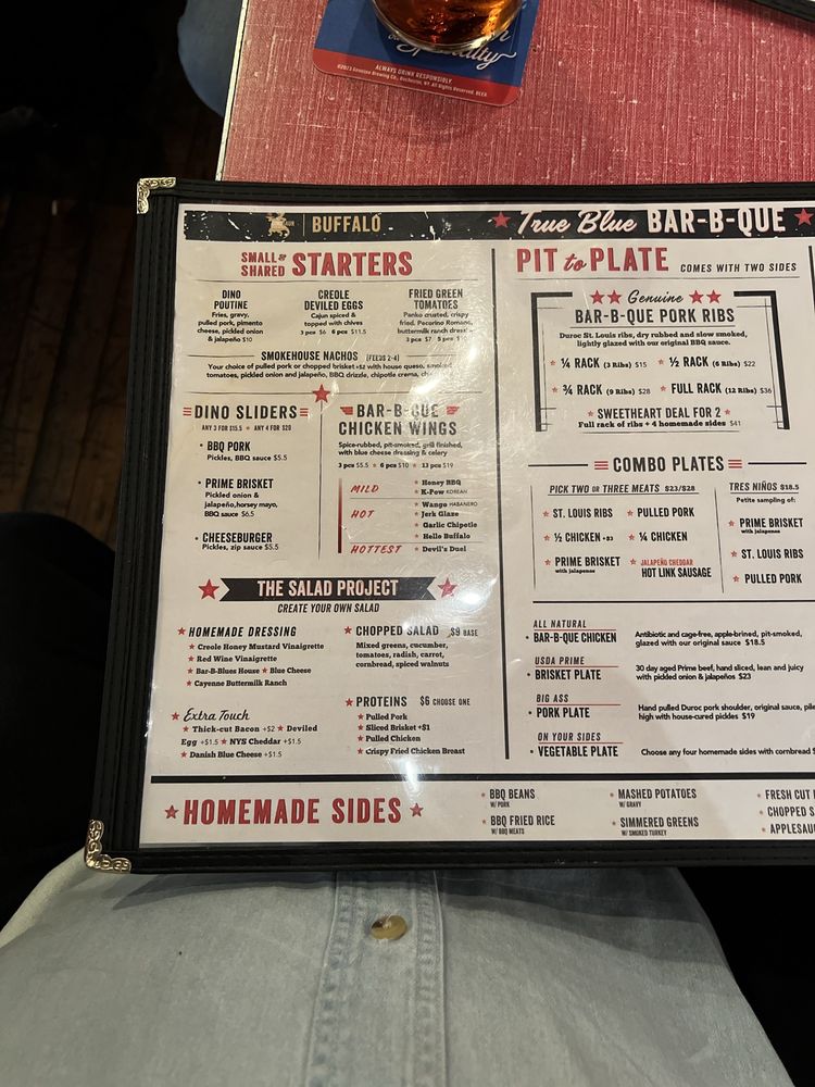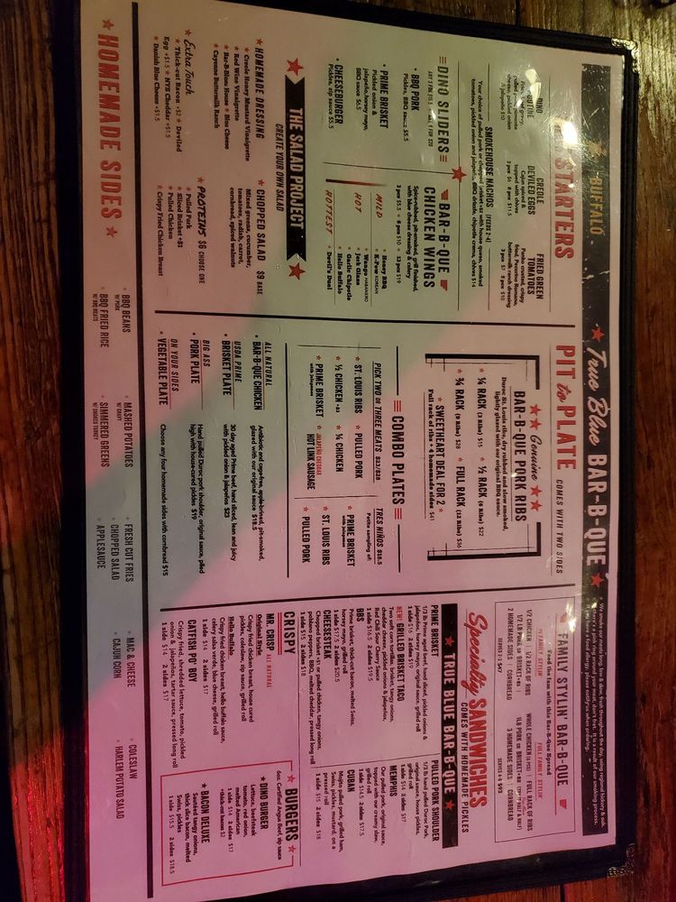 Dinosaur Bar-B-Que in Buffalo, NY offers a diverse menu with a focus on American Barbeque and Chicken Wings. With options for Pescatarians and limited Vegetarian choices, this restaurant provides a range of offerings suitable for different dietary preferences. The starters like BBQ Chili Nachos and Creole Deviled Eggs showcase the bold flavors that Dinosaur Bar-B-Que is known for. The Dino Sliders and Bar-B-Que Pork Ribs are must-try items, with the Sweetheart Deal for 2 offering a generous portion of ribs and sides. The restaurant's casual atmosphere, outdoor seating, and full bar create a laid-back dining experience perfect for enjoying delicious food. Overall, Dinosaur Bar-B-Que is a great spot for groups, families, and anyone looking to indulge in flavorful barbeque dishes.